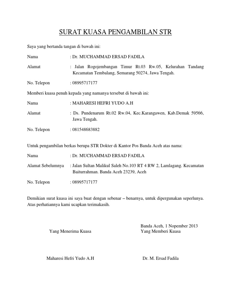 Misalnya yaitu ada kepentingan lainnya mendadak, dan sebagainya. Contoh surat kuasa pengambilan uang contoh surat kuasa yang baik dan benar Surat kuasa merupakan surat yang tujuan dibuatnya adalah untuk memberikan suatu kuasa atau wewenang kepada pihak tertentu guna melaksanakan suatu tugas atas nama si pemberi kuasa. Surat kuasayang bertanda tangan dibawah ini : Biasanya surat berharga ini tidak dapat diambil begitu saja, jika bukan oleh orang yang bersangkutan atau yang nama/fotonya tertera pada surat berharga. Surat kuasa pengambilan uang pada dasarnya sama dengan jenis surat kuasa lainnya, yaitu dokumen tertulis yang menerangkan pelimpahan kekuasaan dari satu pihak ke pihak lain untuk melakukan tugas tertentu. Dengan menggunakan surat kuasa ini maka tidak akan ada keraguan terhadap si penerima kuasa. Dan jika anda sudah melunasinya, maka anda bisa mendatangi kantor finance yang membiayai kredit anda. Dengan ini saya surat kuasa pengambilan ijazah. Untuk contoh surat kuasa, surat permohonan, surat pernyataan, surat keterangan, surat rekomendasi dan contoh format administrasi surat menyurat lainnya. Boleh, dengan membuat surat kuasa notaril atau surat kuasa bermaterai yang dilampirkan dengan fotokopi ktp/sim/paspor pemberi dan penerima q : Penyimpanan dan pengambilan risalah lelang a. Hal ini dilakukan karena si pemberi kuasa tidak dapat melakukan suatu.